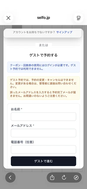 本予約システムでは、ログインしての予約かゲスト予約かをお選びいただけます。